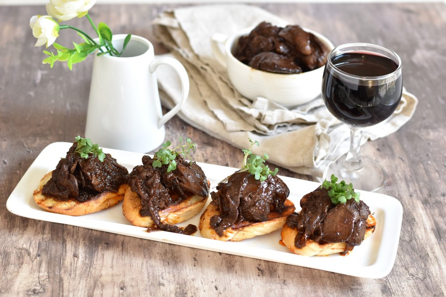 פורסים בגט טרי לפרוסות בעובי של כ 1.5 ס"מ כל אחת, מורחים אותן במעט שמן זית, ומעבירים אותן לטוסטר לחיץ או לתנור מחומם עד להזהבה. כאשר פרוסות הבגט מגיעות למרקם קריספי, מוזגים עליהן את הכבדים עם הרוטב והבצלים ומגישים חם.